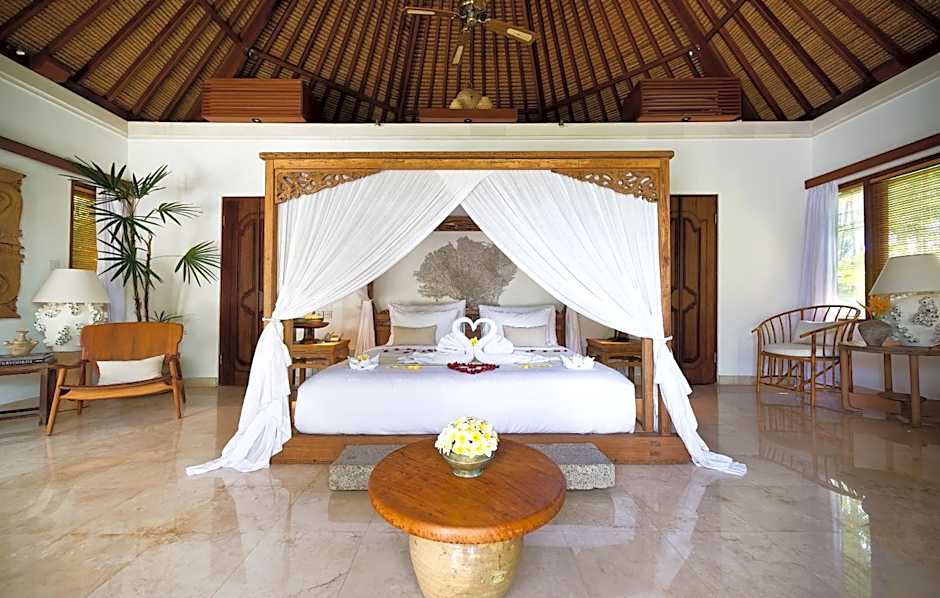 This five-bedroom villa has king size bed, mini-bar, private bathroom, balcony in every room. This Villa surrounded by large tropical garden and river with land size of 2500 square yard. It feature a dining room, media room, and sitting area. Guest can enjoy experienced butler service